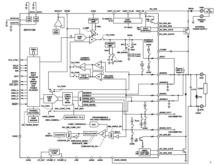 AD74115H是一款軟件可配置的單通道輸入/輸出設備,用于工業控制應用。AD74115H集成在單片上,提供廣泛的使用案例。這些使用案例包括模擬輸出、模擬輸入、數字輸出、數字輸入和電阻溫度檢測器(RTD)和熱電偶測量的功能。AD74115H還有一個集成HART調制解調器。使用一個串行外圍接口(SPI)處理所有與設備的通信,包括與HART調制解調器的通信??赏ㄟ^SPI或通用輸入和輸出(GPIO)引腳來評估數字輸入和數字輸出,來支持更高速的數據速率。