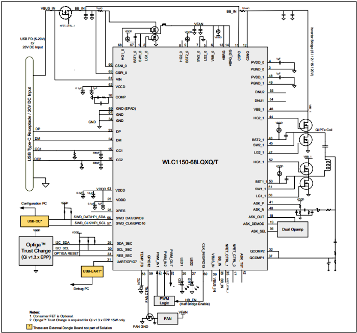 WLC1150提供與各種類型的輸入配置的兼容性,以解決大范圍的高功率應用程序。WLC1150支持輸入電源由USB PD/PPS或直流固定輸入提供的系統電源。IC支持這些輸入配置,而不需要前端DC-DC轉換器有助于實現顯著的系統效率增益,這是高功率的一個重要性能方面系統WLC1150提供了許多可編程功能,用于創建不同的無線發射機解決方案。