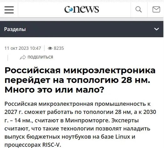 10 月 12 日消息,據(jù)俄媒《生意人報(bào)》當(dāng)?shù)貢r(shí)間周三報(bào)道,俄羅斯工業(yè)和貿(mào)易部提出了微電子發(fā)展路線圖。報(bào)道稱,當(dāng)前該國(guó)的微電子企業(yè)可生產(chǎn) 130nm 制程產(chǎn)品,最新的目標(biāo)是 2026 年量產(chǎn) 65nm 芯片節(jié)點(diǎn)工藝、2027 年在本土制造 28nm 芯片、2030 年則量產(chǎn) 14nm。