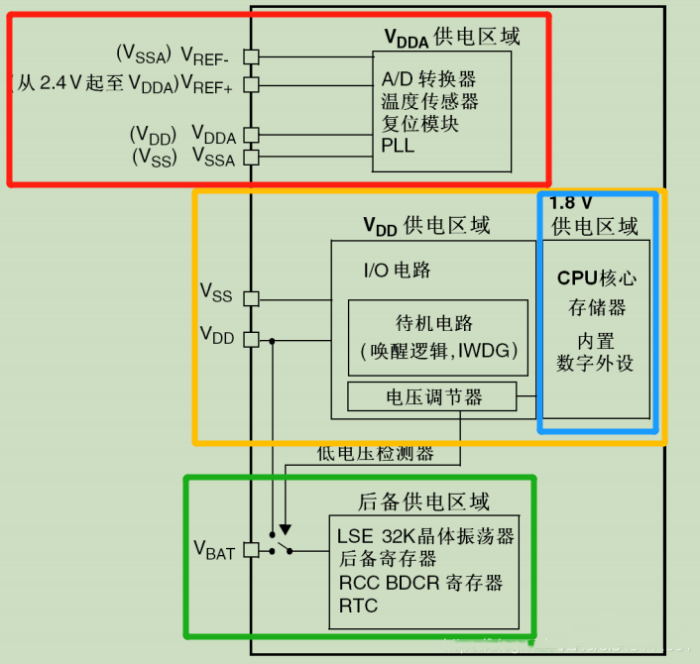 VDD、VSS供電區(qū)域;VDDA、VSSA供電區(qū)域;1.8V供電區(qū)域;后備電源(VBAT)供電區(qū)域;