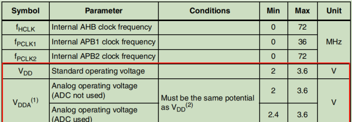 Datasheet上關(guān)于VDD、VDDA、VBAT的電氣參數(shù)如下
