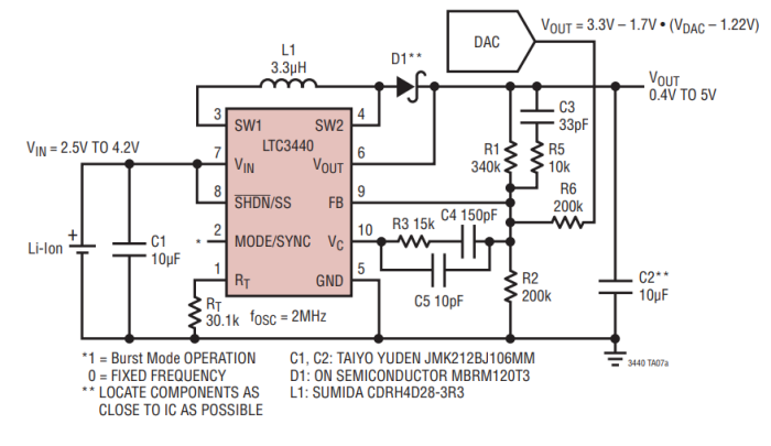 該器件的其他特點包括 1μA 的停機電流、軟起動控制、熱停機和電流限制功能。LTC3440 采用 10 引腳耐熱性能增強型 MSOP 封裝和 (3mm x 3mm) DFN 封裝。