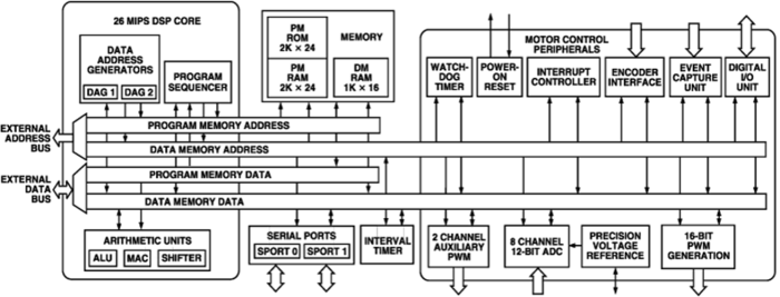 ADMC401BST的DSP內(nèi)核為ADSP-2171,它與ADSP-21xx DSP系列以及ADMC3xx系列集成電機控制器的其它產(chǎn)品完全兼容,并結(jié)合三個計算單元、數(shù)據(jù)地址生成器和一個程序序列器。計算單元包括ALU、乘法器/累加器(MAC)和柱式移位器。DSP內(nèi)核還增加了位操作指令、平方(x2)、偏置舍入和全局中斷屏蔽。此外,ADMC401中還包含兩個靈活的雙緩沖、雙向同步串行端口。