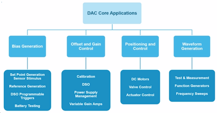 DAC在信號鏈中可以執(zhí)行很多功能,例如偏置的生成、失調(diào)和增益控制、定位和控制,以及像波形的產(chǎn)生等。下圖顯示了一些主要的高端最終應(yīng)用,在這些應(yīng)用中經(jīng)常可以找到特定功能的DAC。