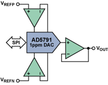 半導(dǎo)體處理技術(shù)、DAC架構(gòu)設(shè)計和快速片內(nèi)校準(zhǔn)技術(shù)的發(fā)展使穩(wěn)定、建立時間短的高線性度數(shù)模轉(zhuǎn)換器成為可能。這種轉(zhuǎn)換器可提供高優(yōu)于1 ppm的相對精度、0.05 ppm/°C溫度漂移、0.1 ppm p-p噪聲、優(yōu)于1 ppm的長期穩(wěn)定性和1MHz吞吐量。這類小型單芯片器件保證性能規(guī)格,無需校準(zhǔn)且簡單易用。AD5791及其配套基準(zhǔn)電壓源和輸出緩沖的典型功能框圖如下圖所示。
