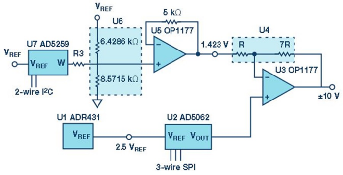 精密DAC適合于要求1LSB(最低有效位)或更小誤差的高精度、高達20位分辨率的應(yīng)用;Nano DAC是ADI受歡迎的低壓單電源產(chǎn)品系列,功耗低,解決方案尺寸最小,適合于需要高密度且存在空間限制的應(yīng)用;digiPOT系列產(chǎn)品可以用于簡化開環(huán)應(yīng)用或匹配容差,提供易失性和非易失性存儲解決方案,支持最多1024位調(diào)整應(yīng)用;直接數(shù)字頻率合成和阻抗轉(zhuǎn)換器可提供快速采集和高精度調(diào)諧分辨率,DDS的目標(biāo)應(yīng)用是需要精密或敏捷的頻率和相位控制的應(yīng)用。ADI還有乘法DAC輸出和雙極性DAC產(chǎn)品系列,可提供快速建立特性和最高+/-10V的寬輸出范圍。乘法DAC是電流輸出DAC,需要緩沖器才能轉(zhuǎn)換為輸出電壓,此類DAC允許將AC或DC輸入信號用作基準(zhǔn)電壓;工業(yè)DAC提供廣泛的可編程輸出范圍,從適合標(biāo)準(zhǔn)電流環(huán)路通信的4-20mA到適合執(zhí)行器控制的±10 V,還能與ADI HART調(diào)制解調(diào)器相結(jié)合,為過程控制和工廠自動化應(yīng)用提供可靠且精確的解決方案。下面是兩個應(yīng)用實例。