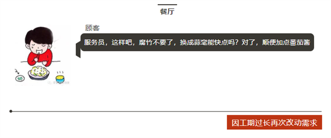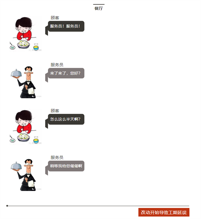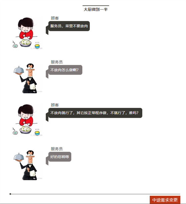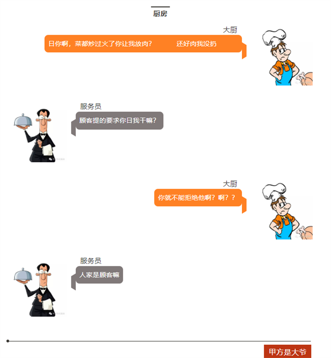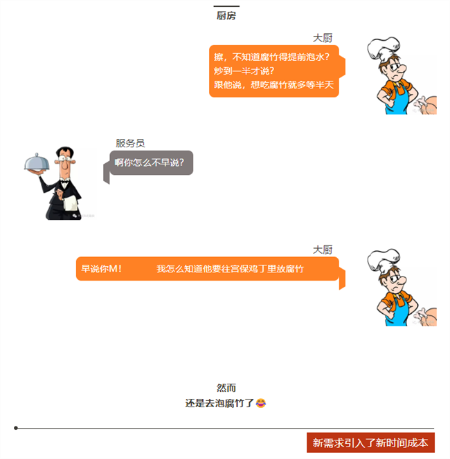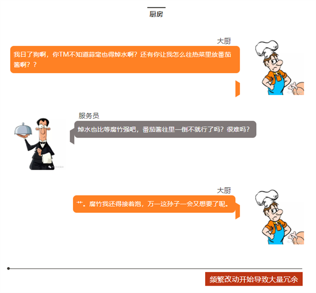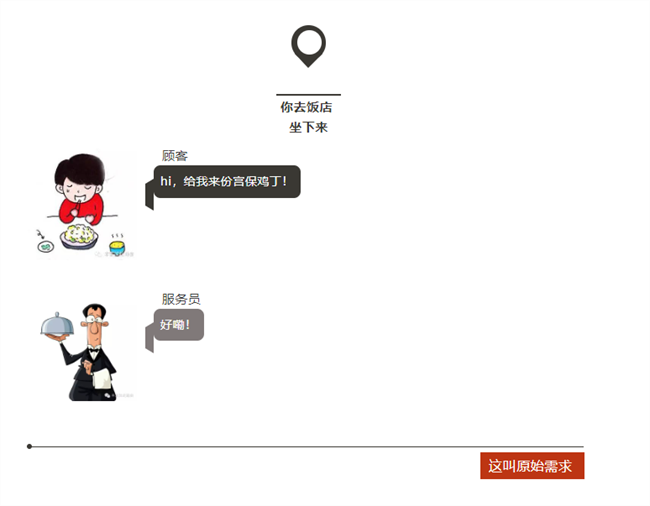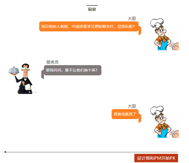 顧客=客戶,服務員=老板,大廚=工程師。