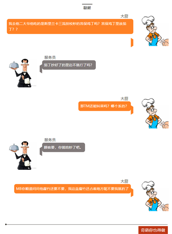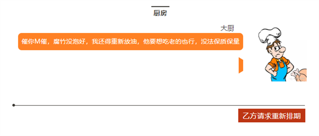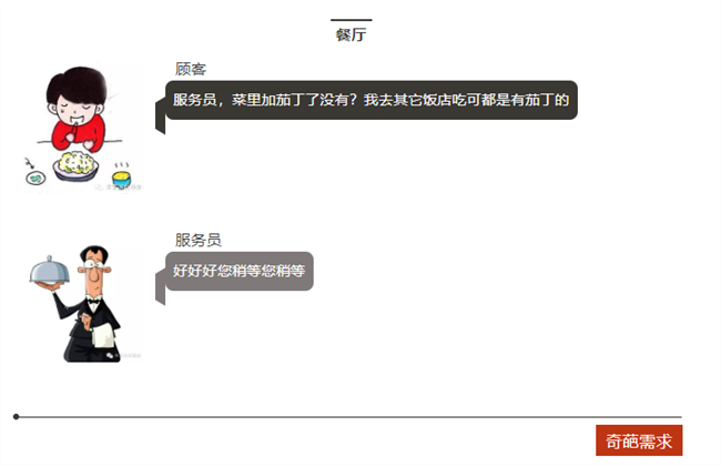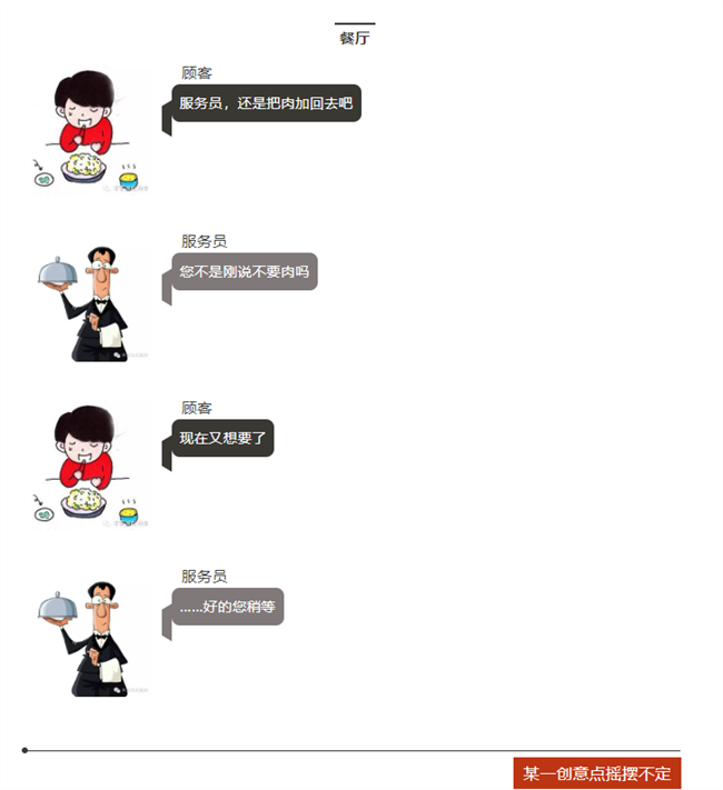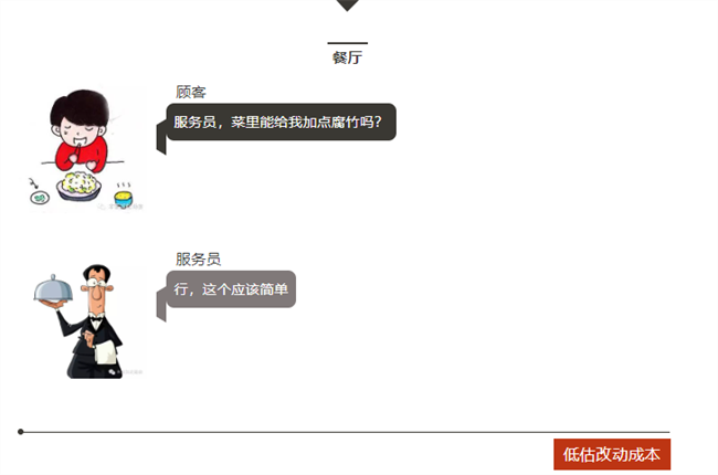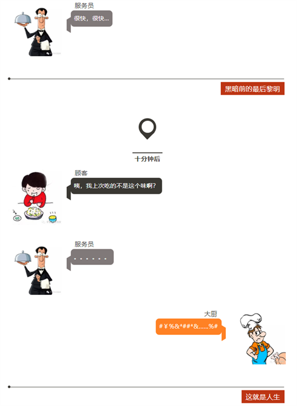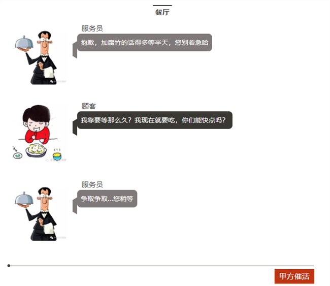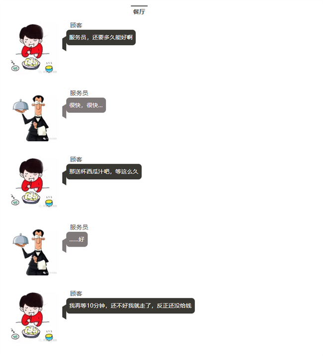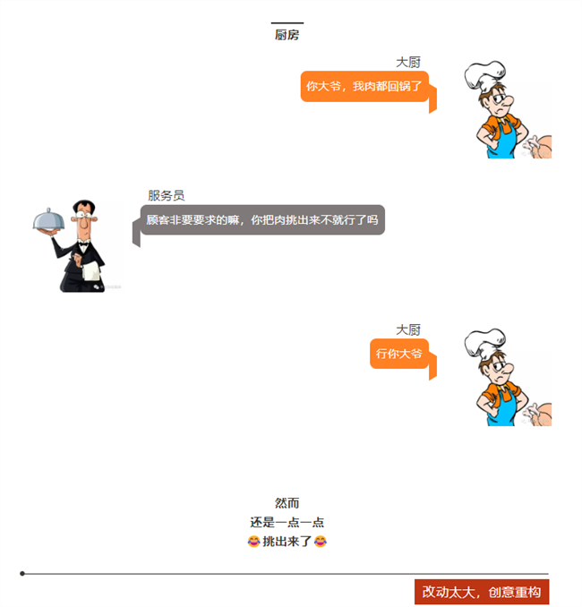 顧客=客戶,服務員=老板,大廚=工程師。