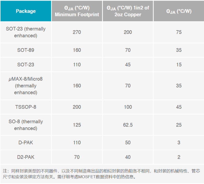 我們可以從MOSFET的ΘJA規(guī)格開始。對于單一管芯、8引腳封裝的MOSFET來講,ΘJA通常接近于62°C/W。其他類型的封裝,有些帶有散熱片或裸露的導熱片,其熱阻一般會在40°C/W至50°C/W (表1)。