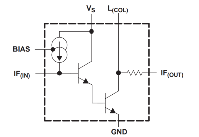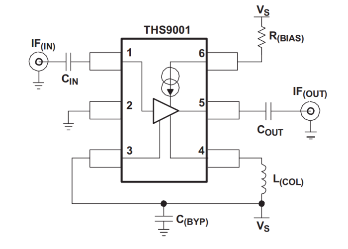 THS9001是一款中等功率、可級聯的增益塊,針對高中頻頻率進行了優化。該放大器集成了與50Ω匹配的內部阻抗,并在VS=5 V、R(BIAS)=237Ω、L(COL)=470 nH的情況下,實現了大于15 dB的輸入和從50 MHz到350 MHz的輸出回波損耗。設計只需要2個直流阻塞電容器、1個電源旁路電容器、一個射頻扼流圈和一個偏置電阻器。