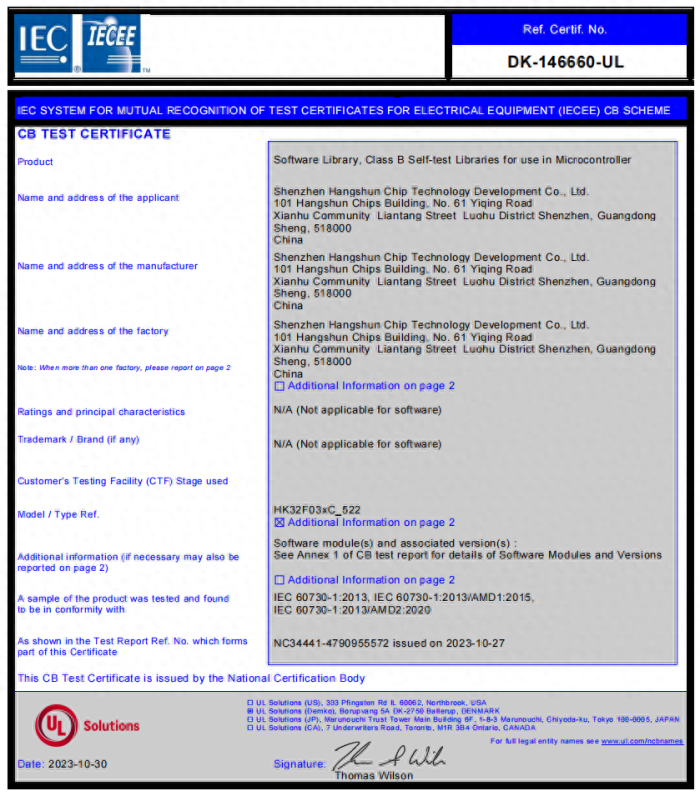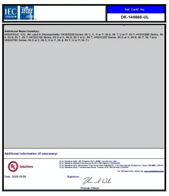 HK32C030/C005/C105/C207/R78X系列產品通過了IEC 60730認證,可提供符合CLASS B標準的功能安全庫,為智慧家電廠商減少終端產品安全認證的時間與成本,助力縮短產品上市時間,從底層提高產品的穩定性和安全性。