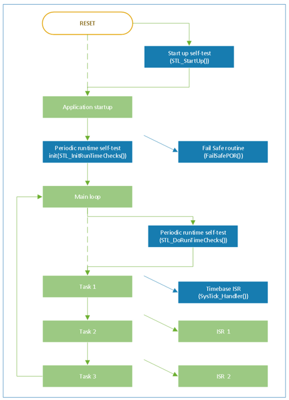 在正常情況下,程序運行會通過Reset復位開始, 經歷綠色框部分來完成所有的功能,其中包括了應用app的啟動配置, Main函數的功能執行以及多個中斷的執行判斷。為了實現IEC 60730的安全功能,我們在程序中增加了藍色部分,其中包括Reset后的模塊安全啟動檢測以及運行時的周期檢測,同時增加了失敗判斷接口,如功能安全軟件總體流程圖所示。