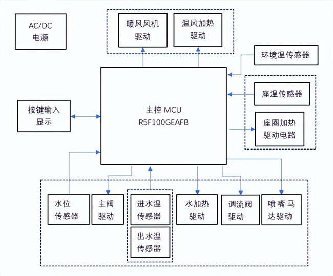 而整個智能馬桶電路中最為重要的元件是位于主控板中間的MCU,控制如此之多的電機、加熱器及傳感器的檢測,不但需要大量的IO腳、ADC輸入還需要很強的抗干擾能力。