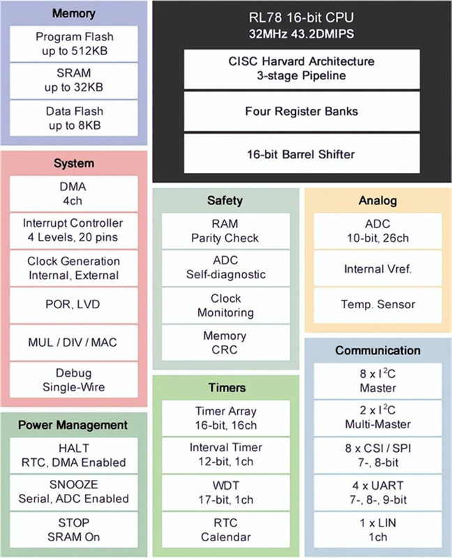 MCU內置了程序FLASH、SRAM以及數據FLASH,程序運行和數據存儲可以同時進行。內置的數據FLASH和EEPROM模擬器相比減少了等待時間,以1字節為單位讀寫,可以通過庫進行操作,不需要外部的EEPROM不但提高了數據的安全性還降低了系統成本。