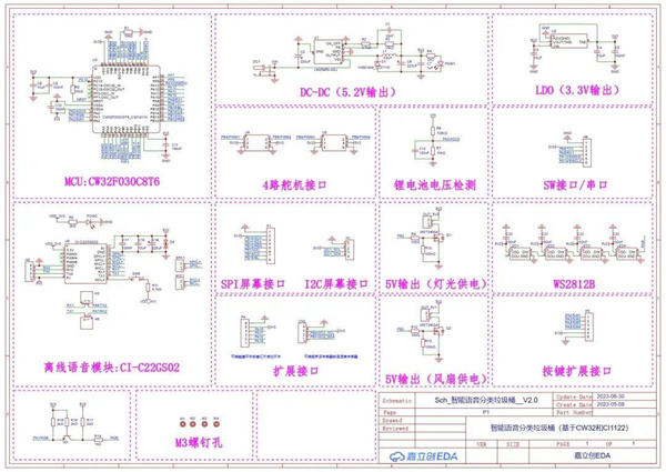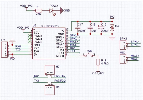 本次設(shè)計采用武漢芯源半導(dǎo)體的CW32F030C8T6作為主控,主要負(fù)責(zé)和離線語音模塊的串口通訊,負(fù)責(zé)輸出4路PWM信號、驅(qū)動IPS顯示屏、控制2路MOS驅(qū)動電路(控制風(fēng)扇和燈光)、驅(qū)動4個WS2812B燈。語音識模塊采用啟英泰倫CI-C22GS02模塊(主芯片采用Cl1122,支持本地200條命令詞以下的離線語音識別),主要負(fù)責(zé)語音識別和播報語音,可通過串口與MCU通訊。