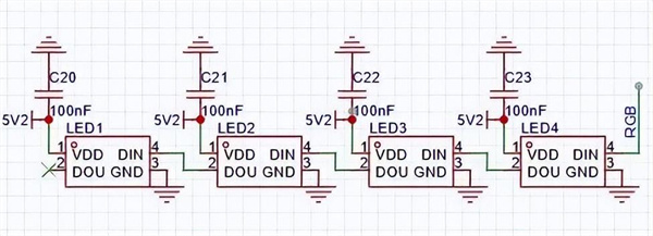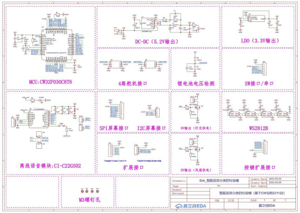 3.四個WS2812B燈作為4類垃圾的指示燈,語音模塊在識別到正確的語音后,由CW32主控來控制指定的燈點亮對應(yīng)的顏色。
