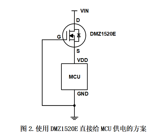 如圖2電路所示,僅使用1顆DMZ1520E,就能給工作電壓為2.7V~5.5V的MCU穩定供電,同時為MCU提供瞬態浪涌保護。