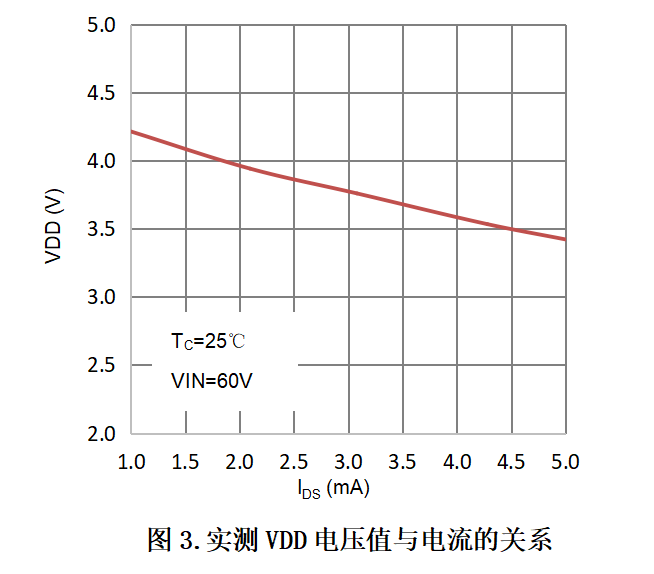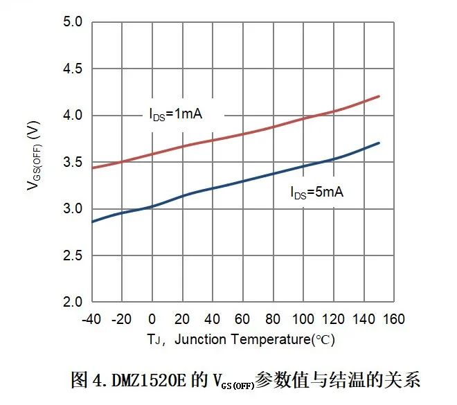 此外,該VDD電壓值與DMZ1520E的閾值電壓參數VGS(OFF)相關,典型DMZ1520E樣品的VGS(OFF)參數值隨結溫的變化關系如圖4所示。