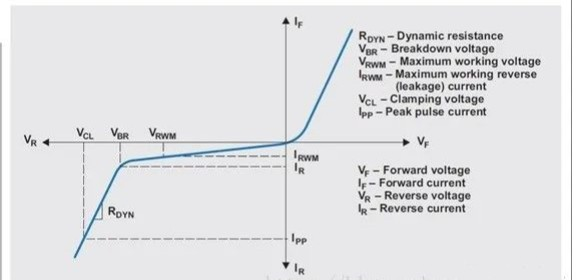 結合特性曲線,說明TVS如何工作。當管子兩段的反向電壓大于VRWM后,管子開始反向導通;反向電壓大于VBR后,管子開始被擊穿,此時電流開始突變;反向電壓大于VCL時,管子處于雪崩擊穿狀態,此時流過管子的電流急劇增加,而管子兩端的電壓差值變化不大(電壓被鉗制)。
