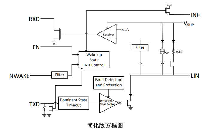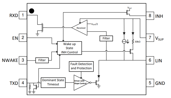 睡眠模式:超低電流消耗,支持來(lái)自 LIN 總線、喚醒輸入(外部開(kāi)關(guān))或主機(jī)微控制器的喚醒事件