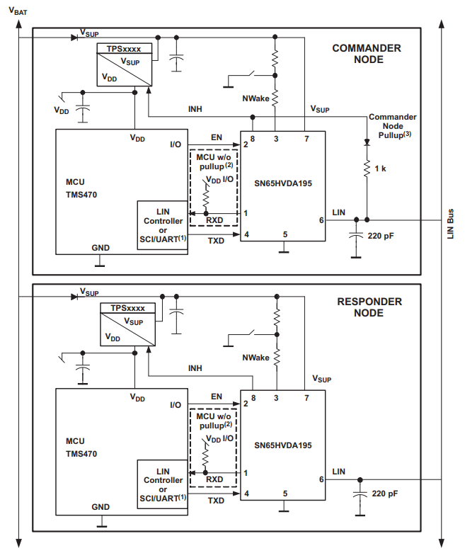 SN65HVDA195 器件是本地互連網(wǎng)絡(luò) (LIN) 物理接口和 MOST ECL 接口,該接口集成了具有喚醒和保護(hù)功能的串行收發(fā)器。該總線是一種單線雙向總線,通常用于數(shù)據(jù)速率達(dá) 20kbps 的低速車載網(wǎng)絡(luò)。該器件能以 0kbps 的有效數(shù)據(jù)速率進(jìn)行傳輸,因?yàn)樗鼪](méi)有顯性狀態(tài)超時(shí)。SN65HVDA195 通過(guò)限流波形整形驅(qū)動(dòng)器將 TXD 上的協(xié)議輸出數(shù)據(jù)流轉(zhuǎn)換為總線信號(hào),如 LIN 物理層規(guī)范修訂版 2.0 所述。接收器對(duì)來(lái)自總線上的數(shù)據(jù)流進(jìn)行轉(zhuǎn)換并通過(guò) RXD 將此數(shù)據(jù)流輸出。總線共有兩種狀態(tài):顯性狀態(tài)(電壓接近接地)和隱性狀態(tài)(電壓接近電池)。在隱性狀態(tài)下,總線被 SN65HVDA195 內(nèi)部上拉電阻器和串聯(lián)二極管拉高,因此響應(yīng)者模式應(yīng)用無(wú)需外部上拉元件。按照 LIN 規(guī)范,指揮官應(yīng)用需要一個(gè)外部上拉電阻器 (1k?) 加上一個(gè)串聯(lián)二極管。