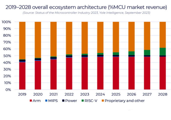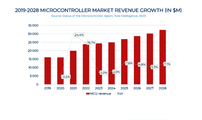 Yole表示,全球MCU出貨量受益于2023年下半年的強(qiáng)勁增長(zhǎng),但上半年的疲軟預(yù)計(jì)將導(dǎo)致下降至265億顆。2022年至2028年的短期MCU市場(chǎng)因全球地緣政治而面臨不確定性,而在自動(dòng)化和連接性的推動(dòng)下,MCU的長(zhǎng)期需求依然強(qiáng)勁,預(yù)計(jì)到2028年將增長(zhǎng)至超過(guò)367億顆。