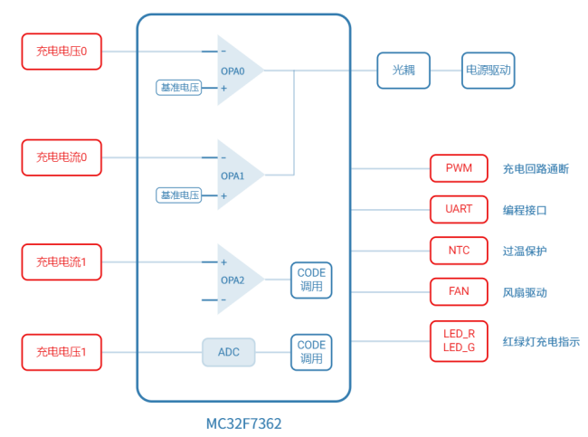 與傳統(tǒng)的充電方案相比,MC32F7362內(nèi)置了兩路純模擬OPA,并集成了相應(yīng)的12位和14位DAC,以實(shí)現(xiàn)對(duì)恒流和恒壓的控制。此外,芯片還內(nèi)置了一路固定放大倍數(shù)的OPA,用于實(shí)現(xiàn)小電流的監(jiān)測(cè)與控制。另外,MC32F7362還具備URAT通訊接口,可以在生產(chǎn)和校驗(yàn)測(cè)試環(huán)節(jié)將準(zhǔn)確的校驗(yàn)值存儲(chǔ)于EEprom內(nèi),從而更快更高效地實(shí)現(xiàn)批量生產(chǎn)。