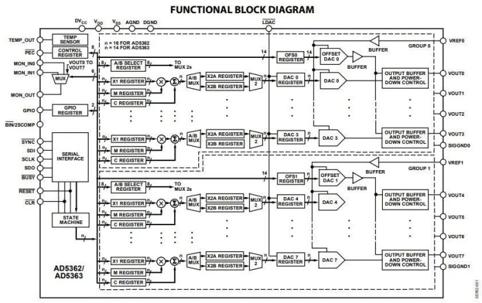 下圖 (圖1) 為 AD5362 內部框圖,它是一款集成 8 通道 16 位的 DAC,它提供的緩沖電壓輸出范圍為基準電壓源的 4 倍,各 DAC 的增益和失調可以獨立進行調整,以消除誤差。該器件分成兩組,每組 4 個 DAC,具有更高的靈活性,且每組的輸出范圍可單獨通過一個偏移 DAC 調節。
