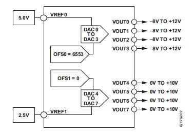 根據 AD5362 的描述,我們了解到器件內部 DAC0-DAC3 使用一個基準源 VREF0,DAC4-DAC7 使用另外一個基準源 VREF1,所以可以利用不同的基準電壓值來實現不同的 DAC 輸出范圍,如下圖 (圖2) 所示: