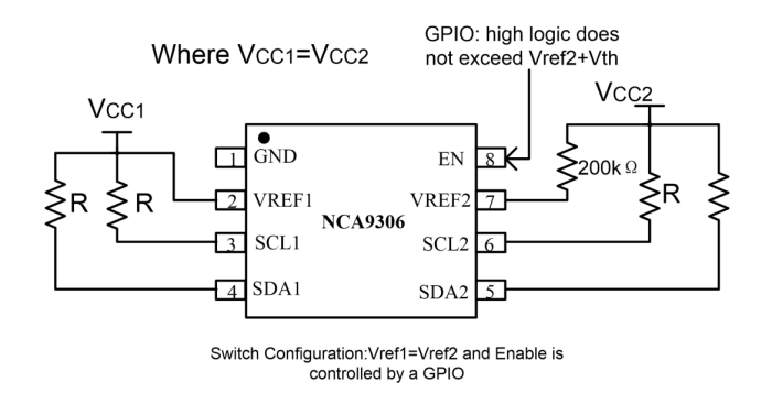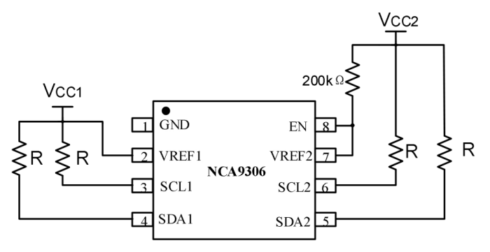 NCA9306-DVSR器件是一款采用使能(EN)輸入的雙路雙向I2C和SMBus電壓電平轉換器,可以在1.2V到5V之間實現雙向電壓轉換而無須使用方向引腳。此開關具有低導通狀態電阻(RON),可以在最短傳播延遲情況下建立連接。當EN為高電平時,轉換器開關打開,并且SCL1和SDA1 I/O被分別連接至SCL2和SDA2 I/O,從而實現端口間的雙向數據流。當EN為低電平時,轉換器開關關閉,在端口之間存在一個高阻抗狀態。除了電壓轉換,NCA9306-DVSR器件還可用于將400kHz總線與100kHz總線隔離開,方法是在快速模式通信過程中控制EN引腳以斷開較慢總線的連接。