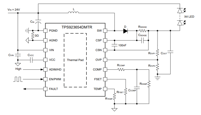 TPS923655DMTR器件還提供多種系統(tǒng)保護(hù),包括 LED 開路和短路、檢測電阻開路和短路、可配置熱折返以及 熱關(guān)斷。一旦檢測到任何故障情況,故障輸出就會發(fā)送 確認(rèn)信號。