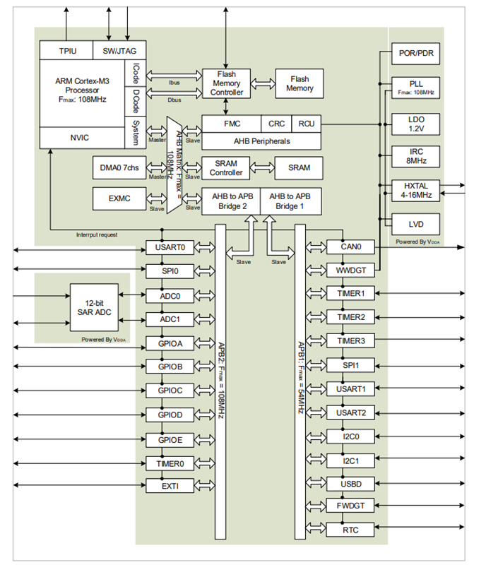 GD32F103系列MCU采用32位ARM? Cortex?-M3內核,運行頻率最高可達108MHz,Flash存取達到零等待狀態,可實現最高效率,同時還提供高達3024KB的片上閃存和高達96KB的SRAM,支持連接到兩條APB總線的增強型I/O口和各種片內外設。此系列MCU提供高達3個12-bit 1MSPS ADC和10個通用型16-bit定時器,1個PWM高級定時器,以及配備標準型和高級通信接口。