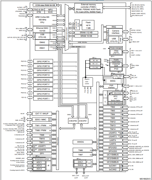 高達192+4千字節的SRAM,包括64千字節的CCM(核心耦合存儲器)數據RAM