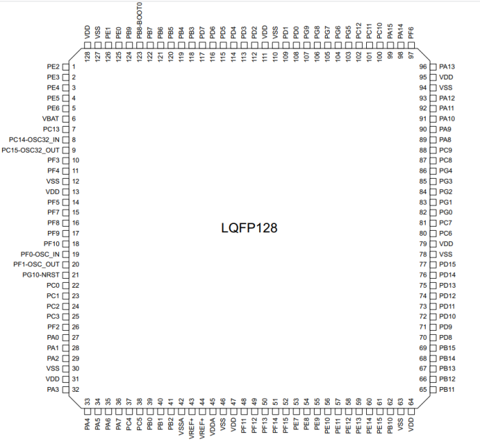 STM32G474QET6嵌入了高速存儲器(512KB的閃存和128KB的SRAM)、用于靜態存儲器的靈活外部存儲器控制器(FSMC)(適用于100引腳及以上封裝的設備)、Quad SPI閃存接口以及連接到兩條APB總線、兩條AHB總線和32位多AHB總線矩陣的大量增強型I/O和外圍設備。