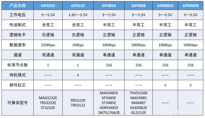 除了RS-232通信芯片外,中微愛芯RS-485系列芯片也在火熱銷售中,現將各參數對比如下: