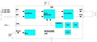 NS4160是單聲道帶AB類,D類工作模式切換功能的音頻功率放大器。芯片內(nèi)部集成了反饋電阻,放大器的增益可以在外圍通過輸入電阻設置。其原理框圖如下: