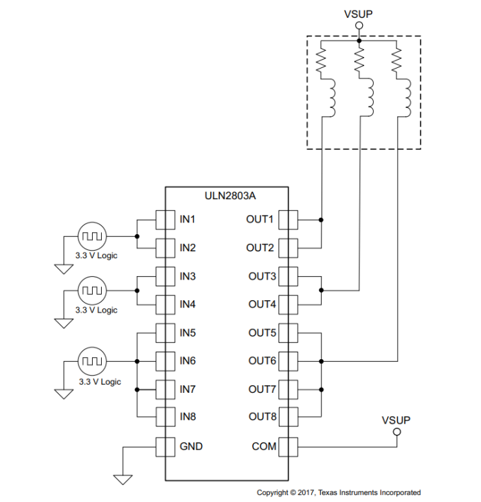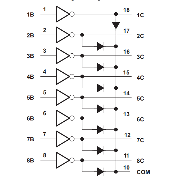 應用包括繼電器驅動器、錘子驅動器、燈驅動器、顯示驅動器(LED和氣體放電)、線路驅動器和邏輯緩沖器。這個ULN2803ADWR器件的每個達林頓對都有一個2.7-kΩ的串聯基極電阻器,用于直接與TTL或5V CMOS器件一起操作。