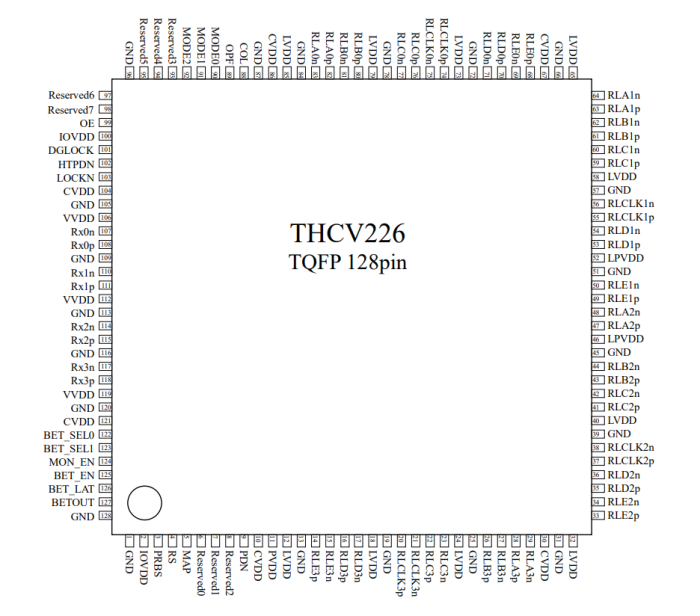 THCV226設計用于支持主機和顯示器之間的視頻數據傳輸。該芯片可通過四對差分的V-by-One HS車道。該芯片采用TQFP封裝,支持高達1080p/10b/120Hz的視頻數據傳輸。最大串行數據速率為3.4Gbps/通道。