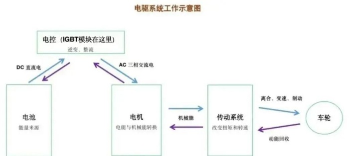 圖:電驅(qū)系統(tǒng)示意圖 電驅(qū)系統(tǒng)工作:在駕駛新能源汽車時(shí),電機(jī)控制器把動力電池放出的直流電(DC)變?yōu)榻涣麟姡ˋC)(這個(gè)過程即逆變),讓驅(qū)動電機(jī)工作,電機(jī)將電能轉(zhuǎn)換成機(jī)械能,再通過傳動系統(tǒng)(主要是減速器)讓汽車的輪子跑起來。反過來,把車輪的機(jī)械能轉(zhuǎn)換存儲到電池的過程就是動能回收。電驅(qū)系統(tǒng)工作示意圖如下: