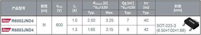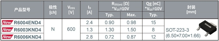 全球知名半導(dǎo)體制造商ROHM(總部位于日本京都市)開發(fā)出采用SOT-223-3小型封裝(6.50mm×7.00mm×1.66mm)的600V耐壓Super Junction MOSFET*1“R6004END4 / R6003KND4 / R6006KND4 / R6002JND4 / R6003JND4”,新產(chǎn)品非常適用于照明用小型電源、電泵和電機(jī)等應(yīng)用。