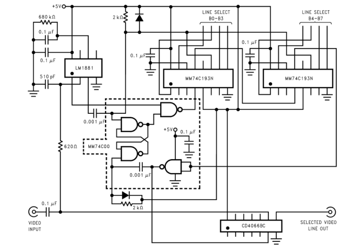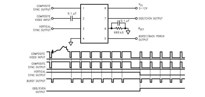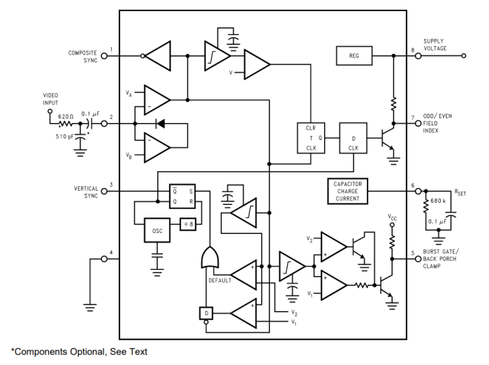 美國國半LM1881MX視頻同步分離器從幅度為0.5V至2V p-p的標準負向同步NTSC、PAL和SECAM視頻信號中提取定時信息,包括復合和垂直同步、突發/后沿定時以及奇數/偶數場信息。該集成電路還能夠為非標準的、更快的水平速率視頻信號提供同步分離。垂直輸出在垂直同步周期中的第一鋸齒的上升沿上產生。如果上述上升沿沒有出現在外部設置的延遲周期內,例如非標準視頻信號的情況,則在時間延遲之后產生默認垂直輸出。