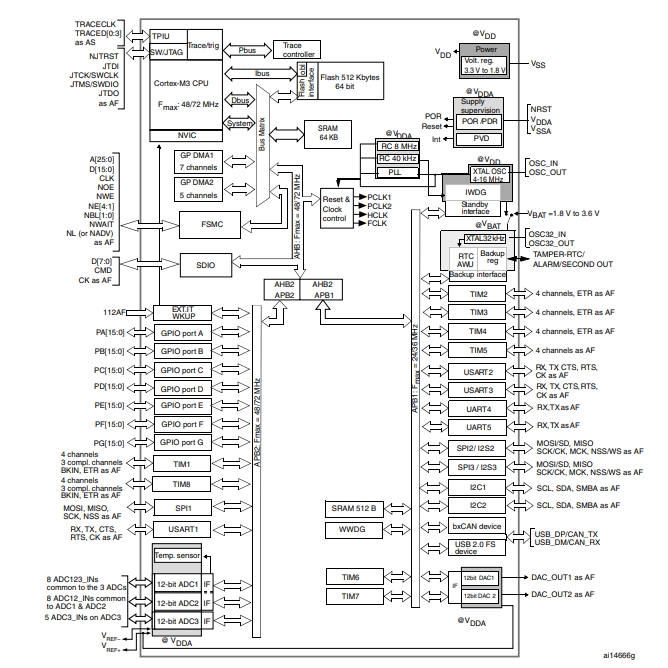 STM32F103RET7提供3個12位adc,4個通用16位定時器加上兩個PWM定時器,以及標準和高級通信接口:最多兩個i2c,三個spi,兩個I2Ss,一個SDIO, 5個usart,一個USB和一個CAN。