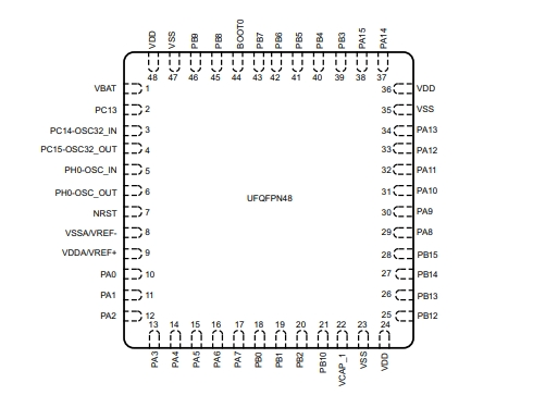 STM32F413CGU6提供一個12位ADC、兩個12位DAC、一個低功耗RTC、12個通用16位定時器,包括兩個用于電機控制的PWM定時器、兩個通用32位定時器和一個低功率定時器。