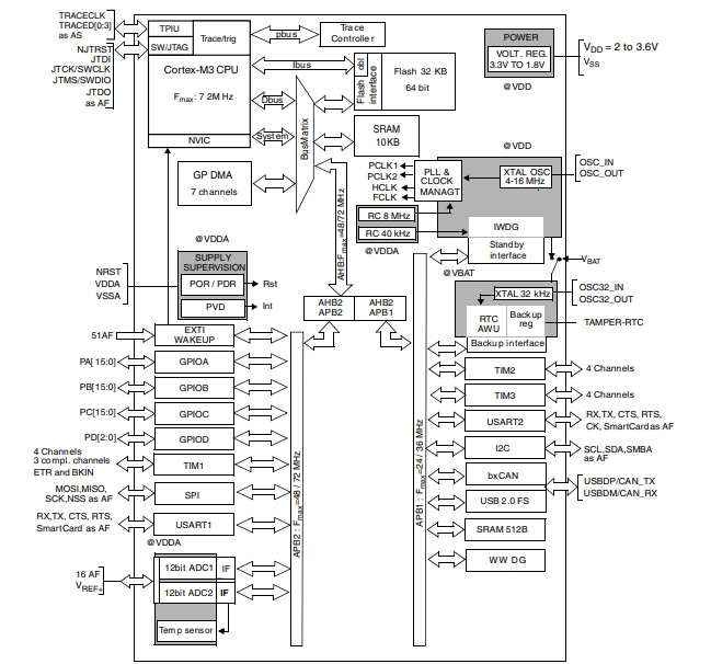 外設(shè):DMA,電機(jī)控制 PWM,PDR,POR,PVD,PWM,溫度傳感器,WDT