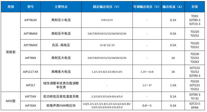 LDO指的是低壓差線性穩壓器,是一種輸入電壓大于輸出電壓的直流交流穩壓器,可以分為雙極型和MOS型。雙極型LDO可以承受高輸入電壓,靜態電流為mA級別,MOS型LDO噪聲更小,靜態電流相比于雙極型也更低,一般在uA級別。 中微愛芯已開發的雙極型LDO有78XX系列、79XX系列、AiP1117系列、AiP71XX系列等,MOS型LDO有AiP75XX系列和AiP76XX系列,涵蓋正電源穩壓器、負電源穩壓器,低壓差正電源穩壓器、輸出電壓調整電路、低壓差穩壓器、可調精密并聯穩壓器等多種類型。以AiP1117-ADJ為例,這是一款最大輸出電流為1A的低壓差穩壓器,內置溫度保護,外接電阻即可實現輸出電壓可調,可廣泛應用于各種需要高精度,低壓降正向穩壓場合。