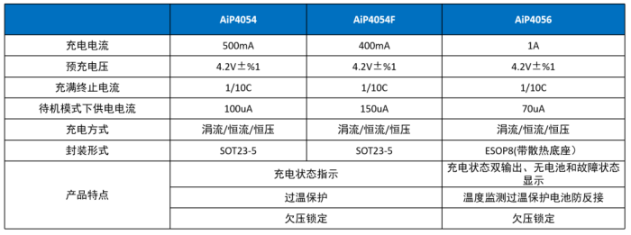 中微愛芯電池管理產品線涵蓋鋰電池和鋰磷酸鹽電池管理監控器、線性鋰電池充電芯片,其中線性鋰電池充電芯片的有多種充電電流可選。以AiP4054為例,這是一款專門為單節鋰電池設計的線性充電芯片,內置完善的保護電路(電流監控、欠壓鎖定、自動再充電、過溫保護、狀態指示功能),充電電流可編程,安全性較高。此外,AiP4054采用體積較小的SOT23-5封裝,外圍電路簡單,非常適用于物流箱藍牙鎖、TWS耳機充電倉、電子煙等低功耗、小體積、快速充電的場合。 常見的電池管理芯片有AiP4056、AiP4054系列等。
