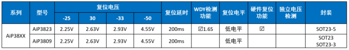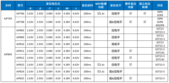 中微愛芯提供帶看門狗功能處理器復位電路、微處理器復位電路、電壓檢測電路等多種電源監控芯片,擁有齊全的復位電壓點。以AiP706為例,這是一款帶看門狗功能的微處理器監控電路芯片,內置復位電路和看門狗定時器(1.6秒超時)。AiP706微處理器監控電路降低了監控系統中電源和電池功能所需的復雜性和組件數量,非常適用于光伏發電系統。 常見的復位芯片有AiP38XX系列,AiP7XX系列和AiP8XX系列,我司設計多種封裝可供選擇,應用場景廣泛