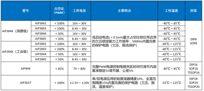 脈寬調制(PWM)是指脈沖寬度調制,也可稱之為定頻調寬,即開關頻率保持恒定,而通過改變在每一個周期內的驅動信號的占空比來達到調制的目的。當輸出電壓發生變化時,通過環路的控制,便會使驅動信號的占空比發生改變,從而維持輸出電壓的恒定。 中微愛芯可提供輸出占空比<100%或<50%的電流模式PWM控制器、直流馬達驅動的PWM控制器。以AiP494為例,這是一款固定頻率脈沖寬度調制電路,集成PWM控制電路所需的幾乎全部模塊,外圍電路簡單。提供共發射極/共集電極輸出,可用于驅動橋式或推挽電路開關管。常見的電源PWM控制器有AiP384X系列、AiP284X系列等,廣泛應用于工業控制、消費電子等場合。