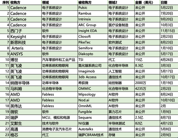 2023年,半導體市場的逆風周期仍未過去,企業收并購的腳步卻不曾停歇。根據公開的信息,《中國電子報》記者梳理了23樁半導體領域的國際收并購案例,發現2023年全球半導體領域的收并購案主要集中在AI、EDA、寬禁帶半導體等領域,呈現以下特點。