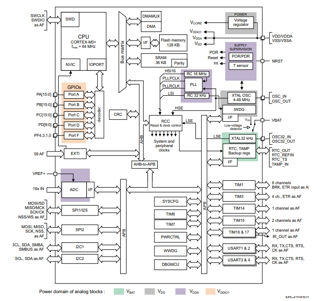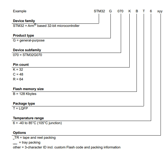 STM32G070CBT6TR包括存儲器保護單元(MPU)、高速嵌入式存儲器(128 KB的閃存程序存儲器,具有讀保護、寫保護和36 KB的SRAM)、DMA和廣泛的系統功能、增強的I/O和外圍設備。